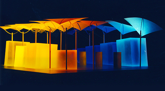 - Präsentationsschwerpunkt sind schwenkbare, überdimensionale Lichtsegel, die als Projektionsflächen für die verschiedenen Lichtquellen dienen.